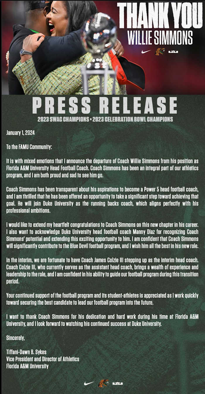 Posted By: S. Moore on January 02, 2024 Florida A&M's head football coach will accept the role as running backs coach at Duke University. Former Florida A&M head coach, Willie Simmons, will accept Duke University’s offer to become the running backs coach under head coach Manny Diaz, according to Matt Zenitz of 247 Sports. Simmons told Vaugh Wilson of HBCU GameDay: "I have full confidence in myself and my abilities, you know, but again, everything in life is about decision, the tough decisions that have to be made. And for me, you know, I rolled the dice to make this move and it's again, it's because of who is with I have the utmost respect for Manny Diaz and what he stands for who he is as a man. As a person as a coach, I've been around him I've seen how he interacts with his players. I know what type of program he wants to run. And that's what's enticing to me to learn from a guy like that and be in that type of environment at a school with a rigorous academic component to it, and just continue to elevate my career. And so all those things went into the deciding factor to make this move. Again, it wasn't an easy one. And again, it's been the hardest decision I've ever had to make in my coaching career. But with much prayer, you know, my wife and I, you know, we felt that we, one has to have done what we said we were going to do here family and to the good Lord opened that door for us. So to allow us to walk through it, and we're gonna walk through boldly and we're gonna set that new challenge." - Willie Simmons Florida A&M made a counteroffer to Simmons, and the FAMU Alumni Association raised over $100K in funds to support the assistant coaches, as reported by Steven Gaither at HBCU GameDay. Simmons, 43, coached the Florida A&M Rattlers to win the 2023 Cricket Celebration Bowl and the 2023 Division I HBCU Football Championship. He posted a record of 66-24 as a head coach with Florida A&M and Prairie View A&M since the 2015 football season. During his tenure at FAMU, his team registered a 45-13 and 22-2 SWAC record since 2021. Simmons leaves Tallahassee to become an FBS Division I assistant coach with the ultimate goal of leading an FBS DI football program. Should the Duke program improve under Manny Diaz, his offensive genius will be highly sought after by other programs in the future. Diaz hired Jonathan Brewer to become the Blue Devil's offensive coordinator after working with him at the University of Miami. Nina King is the Vice President and Director of Athletics at Duke University. She's the third black woman to lead an athletic department at a Power 5 conference since accepting the position in September 2021. King is also a Floridian finishing for Notre Dame and receiving her law degree from Tulane University. SOURCE Clutch Points If you enjoyed this article, Join HBCU CONNECT today for similar content and opportunities via email! |